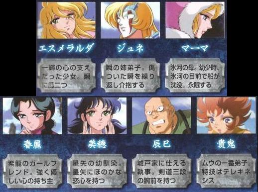 (España) Mitsumasa Kido | Tatsumi | Kiki | Oko | Jaki | Casios | Natassja | Esmeralda | Yacoff | Miho | Seika | Shunrei | Eurydice | Erii | Europa | Akira | Makoto | Tatsuya | Mimiko | Eirene | Hayate | Adolf | Lithos | Garan Appendix