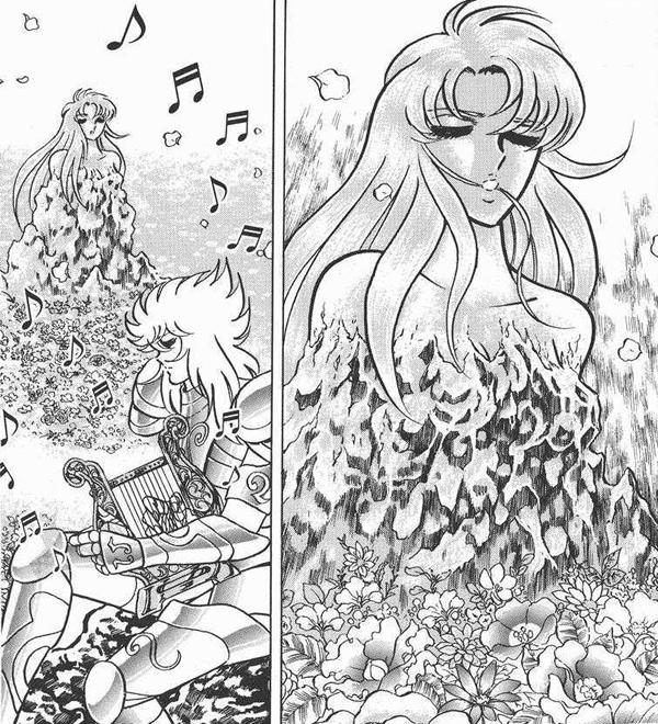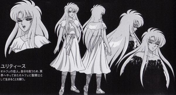 Ninfa de la mitología griega, esposa del legendario músico Orfeo, su nombre significa "la muy hermosa". Es la amante de Orphée de Lyra, nació en Grecia, probablemente en la aldea de Rodorio, ella disfrutó de una gran felicidad al lado del Saint en la Tierra, hasta el día de su muerte prematura a causa de la mordedura de una serpiente, entonces su alma cayó en el reino de los muertos. Aplastado psicológicamente por su desaparición, Orphée descendió vivo a los infiernos para negociar su alma con Hades. Tocado por los motivos del Saint y sus melodías, Hades le permitió regresar a la Tierra bajo la condición de no darse la vuelta para mirar a Eurydice durante el camino de vuelta, pero su ansiada ascensión para volver a ver la luz del Sol se vio frustrada por Pandora y el Specter Pharaoh de Esfinge. Ella fue condenada a permanecer unida al Inframundo con la mitad de su cuerpo convertido en piedra, desesperado, Orphée prometió quedarse a su lado y nunca más volvió a la tierra a pesar de tener la posibilidad de hacerlo, renunciando a la vida a pesar de las súplicas de Eurydice para que la dejara. La situación cambió cuando ayudó a Seiya y Shun a convencer y desenterrar la lealtad olvidada de Orphée hacia Atenea, que arriesgaba la vida contra Hades, y al descubrirse el engaño de Pharao. Finalmente Orphée comprendió que no era correcto intentar hacer regresar a los muertos a la vida, y se despidió de Eurydice para participar en la guerra contra Hades. El tipo de ojitos de insecto que luce eran comunes en los manga de Osamu Tezuka y de Ishinomori, más bien son un invento de Tezuka, al igual que la estética manga/anime. Ishinomori los usaba mucho tambien, y muchos mangaka de los 60's y 70's lo hicieron, pues usaban la estética de Tezuka e Ishinomori. Son frecuentes en personajes meláncolicos y tristes, o misteriosos, y tambien en aliens o no humanos, o en animalitos. En Saint Seiya, Kurumada le dio ojitos asi a Hydra Ichi, pero menos expresivos en su caso, son igualitos a los de Tezuka en Chiyōsei Papillon Myu, en el Black Dragon Saint, en Eurydice y en Artemis.