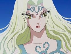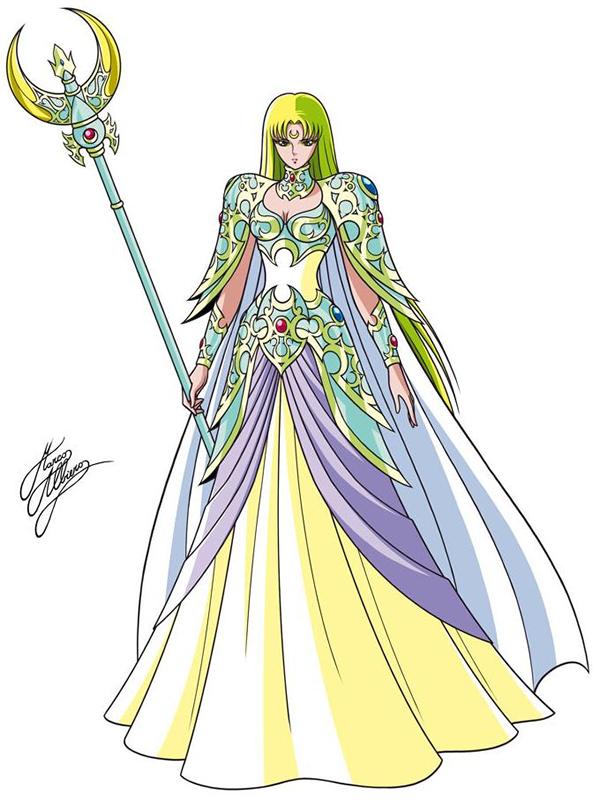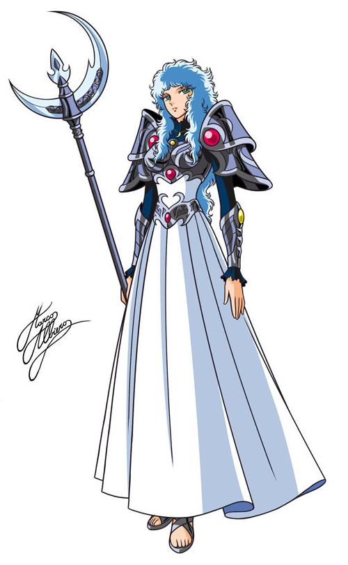 Artemis (Artemisa) es la diosa de la luna que reina en el mundo correspondiente. Es una hermana de Atenea que la ama, a pesar de la severidad que le demuestra. Artemisa es la diosa de muchas cosas, pero el manga se centra principalmente en la Luna (o más bien, en las esperanzas de Atenea). El hecho de que sus guerreras sean arqueras da la impresión de que Kurumada también ha querido hacer hincapié en ella como la diosa de la caza. Vemos que es muy seria por naturaleza, y considera las batallas de Atenea como una afrenta al mismo Olimpo. Eso no quiere decir que no le importe. A pesar de sus intentos de golpear a su hermana, ella está tocada emocionalmente por la determinación de Atenea, a pesar de mostrar una cara impasible. Kurumada juega un tanto con los atributos de Artemisa, la diosa cazadora y la diosa de la luna, que tradicionalmente están separados en la mitología clásica. Parece que va a hacer otra mezcolanza. Su armadura (¿Kamui?) es de un diseño interesante. Tiene una forma muy similar a la armadura de los Satellites, lo que hace que nos preguntemos si las armaduras de los guerreros asociados a los diversos dioses se basan en su propia armadura, en una escala menor. Cuenta con joyas en su interior, y cubre menos porción corporal que la propia armadura de Atenea, apta para una diosa de la caza, que necesita ser muy sigilosa, rápida y móvil para localizar y cazar a sus presas. Sin embargo, debe suponer todo un desafío para cualquiera ir de caza con una falda tan larga y una capa. Como la mayoría de los Satellites, ella luce una media luna en la frente. Por su apariencia, algunas cosas nos vienen a la mente. En primer lugar, ella tiene el símbolo de la luna en la frente, que se ajusta a su rol. Además, parece mantener los ojos casi siempre cerrados (apenas los ha abierto). Ella también parece tener puesta algún tipo de capa. Lo que es interesante es que ella se presenta principalmente como la diosa de la Luna, y así es como Atenea se refiere a ella, puede indicar un vínculo más fuerte con su hermano gemelo como Dios del Sol. Otra cosa a destacar es que Atenea optó por solicitar su ayuda en vez de acudir a Apolo. Ambos podrían haber logrado su propósito, como gobernantes de la Luna y el Sol, si su objetivo principal era afectar al flujo del tiempo. ¿Quizás Atenea acude a Artemis porque es la mayor de los dos?, ¿Acaso siente Atenea un parentesco más fuerte con su hermana?, ¿O es el hecho de que Artemis sea la patrona de las mujeres, desde la infancia hasta que se casan?. Cualquiera que sea el caso, como diosa virgen, Artemisa, por definición, nunca sintió amor. Al menos esa es la forma en que los griegos entendían el concepto de la virginidad, más allá de las meras consecuencias físicas. Apolo, por otro lado, está bastante familiarizado con todo el asunto. Seamos realistas, el tipo es un jugador. Es bastante ingenuo por parte de Atenea pensar que podría influir en su hermana jugando la carta de amor. Debería conocerla mejor. Una cosa que sorprende es que la presencia de Shun fuera autorizada ante ella. Por supuesto, esa no sería una actitud que el más viril de los hombres consideraría, pero son notoriamente diosas vírgenes delicadas cuando se trata de permitir que los chicos accedan a sus templos.