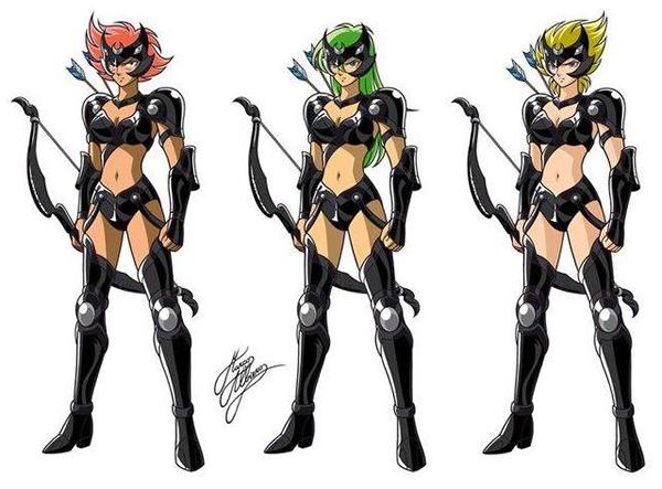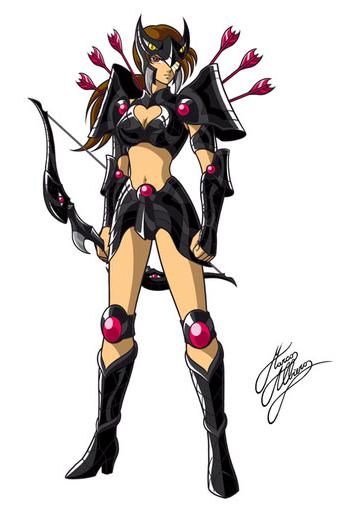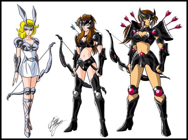Fanart de Marco Albiero (Italia) Tipos de satélites Hemos podido comprobar que, al igual que sucedía con los Saints de Atenea y los Mariners de Poseidón, existe una jerarquía interna y varios rangos o grados de poder entre las Satellites, con grupos que visten armaduras con características diferentes. Hasta el momento han sido mostrados dos tipos distintos de Satellites: las satélites blancas y las satélites negras. Es muy posible que exista un tercer grupo de élite que aún no haya sido presentado de otro color, al menos no estaría nada mal ^^. En todo caso, el célebre fanartista italiano Marco Albiero nos ha plasmado este detalle en varias de sus obras. En aspectos generales los diseños de Kurumada siguen la regla básica entre armaduras, a mayor protección porcentual del cuerpo de la portadora, mayor el poder de la guerrera. SATÉLITES BLANCAS Las Satélites blancas actúan como Guardia Real, custodian el Templo de la Luna, donde se encuentra la diosa Artemis, y parecen estar bajo el bando de la comandante Lady Callisto. Estos Satellites regulares (que parecen ser como Sub-Bronze Saints de Atenea, Tritones de Poseidón o Skeletons de Hades) visten una túnica plateada con ropa blanca y tensan arcos del mismo color. Visten armaduras de un color blanco plateado, que recuerda el color de la luna. Su casco tiene en el centro una pequeña luna creciente. Esta referencia se tomó de algunas representaciones de Diana, la diosa romana de la Luna, forma romana de Artemisa / Artêmis. Por otra parte, sus yelmos representan dos "orejas" de conejo separadas por una luna creciente, que es una referencia a un viejo mito del conejo de la luna, muy famoso en oriente. Podríamos llamarlas los conejitos de la luna, debido a las orejas de conejo en sus tiaras. Sus protecciones apenas cubren el cuerpo más allá que un Bronce Cloth, y llevan vestidos civiles, a la antigua moda. Todas ellas usan arcos, que son todos del mismo estilo, lo que refuerza la idea de que son meros soldados. Además, lo curioso es que no hay ni un solo hombre entre los Satellites. Atenea sólo mostró 3 mujeres bajo su mando (Shaina, Marin y June), Poseidón tiene a Thetis y Hades sólo a Pandora. Pero Artemisa está rodeada de arqueros femeninos. Los soldados Satellites no son muy impresionantes a nivel de poder, pues Shun derrota a varios de un solo golpe.