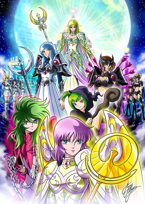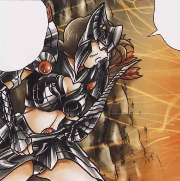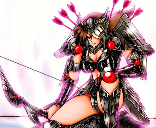 Fanart de Marco Albiero (Italia) Las armaduras que visten los sirvientes de la diosa Artemis, Callisto, Lascomoune y sus subordinados cubren menos área del cuerpo que los Cloths. Al igual que con las armaduras de los Blue Warriors, no hay datos conocidos sobre estas corazas aun, ni siquiera su nombre. Si Kurumada revela algo en un futuro, esa información será agregada. Ejército Ayuda de campo Lady Callisto se presenta con esta función, pero no está claro si este es su único rol, o si también forma parte de los Satellites. Ella tiene por lo menos un nivel jerárquico que le permite dar órdenes a los Satellites que se pueden ver, lo que deja suponer que existen un patrón jerárquico similar al de Pandora y los Specters. En Saint Seiya ~ Next Dimension, Atenea trata desesperadamente de encontrar una forma de salvar a Seiya de la espada invisible de Hades ('Invisible Sword"), y decide ir a pedir ayuda a su hermana mayor Artemisa, diosa de la Luna. Ella va al Olimpo junto con Shun y llega al Templo de Artemisa, tras una peripecia en el camino debido a la bruja Hécate. La audiencia con Artemisa no le aporta una solución inmediata al caso de Seiya, pero, no obstante, proporciona información valiosa sobre Chronos, el dios del tiempo, quien podría realmente resolver este problema.