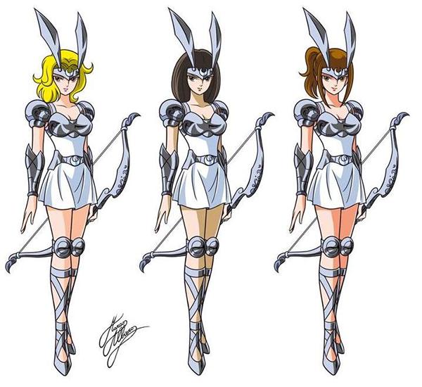 Para quienes saben un poco acerca de la mitología griega, es muy fácil percibir las referencias a la propia diosa. La pequeña luna en el casco sirve como un símbolo de la diosa misma. El color claro de sus túnicas y armaduras se refiere, además de al propio color de la luna, a la pureza y la virginidad, ya que para la diosa la castidad también es sagrada. De hecho todas las chicas son de piel clara y exhiben un aspecto bello y delicado. Lo más destacado, sin embargo, son los yelmos, con forma de diadema (un diseño muy similar a la diadema del Silver Saint Asterión de Perros de Caza), que en la parte alta tienen dos orejas, que podrían representar a los perros de Artemis, que la acompañaban en sus cacerías, o bien a conejos / liebres, curiosidad que analizaremos más adelante. En la mitología se dice que las sacerdotisas de Artemisa hicieron voto de castidad para mantenerse puras y que vestían de blanco como la luna - lo que probablemente originó la leyenda de casarse con una virgen, vestida de blanco -. Este hecho inspiró a Kurumada a hacerlas vestidas de blanco con armaduras plateadas.