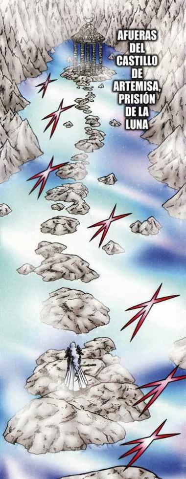 Templo de la Luna 月の神殿 - tsuki no shinden, literalmente: 月: luna, 神殿: templo El Templo de la Luna es la residencia de Artemis y sus Satellites. El trono de la diosa posee una gran obertura hacia el cielo que deja ver la luna. El mundo que bordea el Templo de la Luna es parte del Olimpo. El paisaje es poco variado, aparte de una enorme columna jónica coronada por una luna, símbolo de la propia diosa Artemis, que aparece en el centro de una encrucijada de caminos. Shun y Saori conocen allí a la bruja Hécate, transformada en cuervo. El cielo está, por supuesto, cubierto por una inmensa luna (y por lo tanto, "a priori", el mundo de la luna no está en la luna ^^).