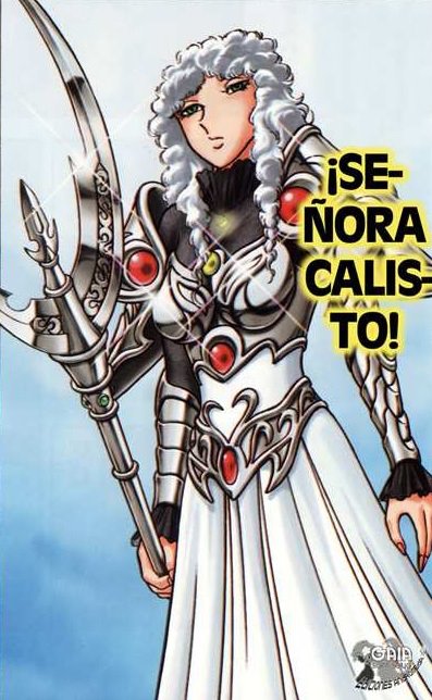 Fanart de Marco Albiero (Italia) ARMADURA: Callisto usa una armadura similar a la de Artemis, pero de un color plateado, y posee un cetro con una larga punta en forma de media luna, similar al de Artemisa. Ella tiene el pelo de color azul claro, y está por encima de la mayoría de los Satellites. HERENCIA MITOLÓGICA: La elección de Calisto como segunda de Artemis al mando es interesante. Es bastante seguro asumir que Calisto traiciona la confianza de la diosa según la herencia mitológica. La existencia de la constelación de la Osa Mayor (basada en la historia de Calisto transformada en un oso por la airada Artemis, por la celosa Hera o por el impio Zeus) parece confirmar la leyenda. O al menos que Atenea estaba familiarizada con ella cuando se creó esa constelación. Sin embargo, ella (o su encarnación actual) está de vuelta al lado de la diosa. A menos que no exista una relación más allá del nombre entre la Callisto de los mitos y la Callisto de ND. Quién sea ella, tiene que ser muy poderosa, a juzgar por lo similar en el diseño de su armadura y la de su diosa. En la mitología griega Calisto era la hija de Licaón y una ninfa de Artemisa, que había hecho voto de castidad, el juramento de permanecer virgen, al igual que las otras ninfas al servicio de esta diosa, pero Zeus acabó por seducirla y abusar de ella. La ninfa quedó embarazada y dio a luz a un hijo, Arcas, quiso esconder su estado a Artemis pero la diosa la amenazó con sus flehcas. Zeus la transformó en osa para esconderla. Según los recitos, Calisto fue asesinada por Artemis con una flecha de plata, o por Arcas que no reconoció a su madre transformada, y Zeus colocó a los dos en el cielo bajo la forma de las constelaciones de la Osa Mayor y la Osa Menor. Otra hipótesis para la constelación de la Osa Mayor es que sería la ninfa Cynosura quien habría cuidado de niño a Zeus, mientras este se encontraba escondido a la vista de su padre Cronos, y Zeus la habría dado las gracias haciendo esta constelación. Callisto es también un satélite natural de Júpiter, siendo la segunda más grande después de Ganímedes, y es la tercera gran luna de nuestro sistema solar, casi tiene el tamaño de Mercurio.