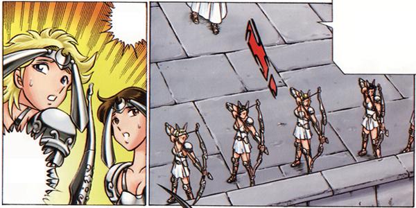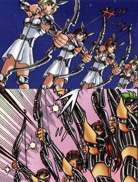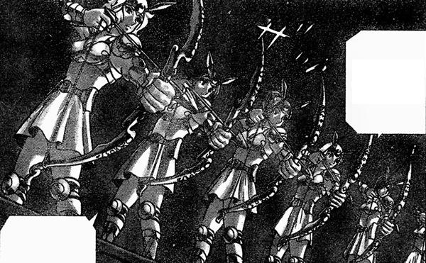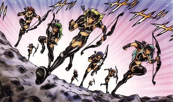 - guerrero sagrado (Saint) Por ahora, el ejército de Artemisa parece compuesto únicamente por mujeres. Esto puede hacer pensar en la leyenda griega de las amazonas, una tribu de mujeres guerreras que rechazaban a los hombres en sus filas. En la cultura popular el arma característica de las amazonas es el arco y flechas, lo que hace más obvia la referencia. De todos modos, da la impresión que las Satellites han de ser un ejército menor de Artemis. La principal fuerza militar de los dioses Olímpicos deben ser los Angel porque Tōma sirve a Artemis y según el manga introductorio al film Tenkai-Hen Overture, ahora apócrifo donde apareció la primera vez, también a Zeus. No da la impresión que cada dios olímpico tenga su propio ejército, sino que lo forman los Angel y ellos son al parecer tan fuertes como los Gold Saints (sería una idea inteligente de Kurumada para evitar tener que diseñar un ejército para cada uno de los doce dioses).