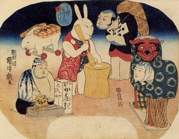 Para los japoneses, el conejo de la luna está moliendo / amasando los ingredientes para hacer mochi (bola de arroz) en un mortero, una especie de arroz glutinoso, para hacer la famosa galleta mochi, comida en los festivales, las celebraciones de Año Nuevo, y dada como ofrenda a los dioses en el altar sintoísta. Por cierto, el proceso de fabricación tradicional de mochi consiste en moler el arroz en un mortero llamado "mochi-tsuki", que se escribe con otros kanji, pero cuya pronunciación también puede significar "mochi de la luna" y que se asemeja a "mochizuki", que significa "luna llena". Vale la pena reseñar que los mochi son galletas blancas y redondas, como la luna llena. Además, está la historia budista de Śaśajâtaka, o "Cuentos de Jataka", que narra como un mono, una nutria, un chacal y un conejo decidieron practicar la caridad en un día de luna llena. Cuando un anciano pidió comida, el mono tomó un poco de fruta de un árbol, la nutria atrapó un pez y el chacal robó un envase de crema agria. El conejo, a su vez, ofreció su propia carne, arrojándose al fuego que el hombre había hecho. Sin embargo, el fuego no lo quemó. El anciano resultó ser Sakra, un deva, y debido a la gran virtud del conejo, dibujó su imagen em la luna, para que todos lo vieran. Los fans de Saint Seiya probablemente recuerdan la leyenda contada por Shiryu a Seiya sobre un viajero hambriento que se encuentran frente a un oso, un zorro y una liebre (cuando de camino al templo de Escorpión Seiya y Shiryu temen que Shun se haya sacrificado para calentar a Hyoga en el templo de Libra). El oso siendo fuerte atrapó un pescado y el zorro siendo astuto recolectó algunas uvas. Los animales reúnen a sus alimentos alrededor del hombre, pero el conejo, demasiado débil para poder ofrecer algo más que hierba, acaba finalmente por lanzarse en el fuego para ofrecerse a sí mismo como alimento. En la tradición budista, este conejo es el mismo conejo de la historia de Shiryu, quien se tiró al fuego para alimentar a un viajero. Existen varias versiones de la misma historia en los folclores chino y japonés, donde los compañeros del conejito cambian (ya sea un mono y un zorro, a veces un zorro y un oso, etc.). Leyendas similares también se cuentan en México y entre los indios de América. La leyenda china incluso fue mencionada en una conversación entre el Apolo 11 y Houston, antes de alunizar en la Luna. En la versión original de esta leyenda, el conejo no muere, ya que el viajero cansado resulta ser realmente Sakra, rey de los Devas (deidades benevolentes) quien, afectado por la virtud de los conejos, lo salva de las llamas y coloca su imagen en la luna. Notemos que a pesar de la distancia geográfica, la cultura mexicana posee también la misma leyenda, pero con Quetzalcóatl en lugar de Sakra. Tampoco hay que olvidar que el conejo o liebre es un objetivo clásico en el juego de la caza, y estamos en el reino de la diosa de la caza. También la liebre se corresponde a la reproducción y la Luna al ciclo. Las liebres son lunares, ya que duermen durante el día y viven la noche, también como la luna saben aparecer y desaparecer silenciosamente. La leyenda del conejo de la luna Cuenta una leyenda budista japonesa, que un día iba un viejo peregrino caminando. Llevaba muchas horas de viaje y ya se encontraba fatigado, pues por el camino no había ni comido ni bebido. Cuando sus fuerzas comenzaban con abandonar su cuerpo se encontró en el camino con un zorro, un mono y un conejo. Al verlos se aproximó a pedir a los animales un poco de alimentos. El mono se paseó de árbol en árbol recogiendo frutas para el peregrino, el zorro cazó un ave y el pobre conejo no pudo conseguir nada. Al ver que sus compañeros habían conseguido sustento y la tristeza en la cara del peregrino, el conejo se puso a recoger ramas y hojas secas. Las apiló y encendió fuego, cuando las llamas habían prendido bien las ramas y el fuego era fuerte, el conejo saltó dentro ofreciéndose como alimento para el anciano. Este al ver al conejo ardiendo en el fuego y sacrificando su vida por él, reveló a los animales que se trataba de Śakra, una deidad que estaba poniéndolos a prueba. Apagó el fuego y recogió los restos y se fue hasta luna para enterrarlo. El conejo fue dibujado en la superficie de la luna por Śakra para conmemorar su generosidad sin límites. Esta es la leyenda que los japoneses le cuentan a sus niños para inculcarles el espíritu de compromiso y entrega. Les dicen que los conejos saltan porque quieren llegar a la luna para ver a su héroe. En Japón el mes de septiembre se considera, por varias razones climáticas, como el más propicio para la observación de la luna ("tsukimi", ceremonia célebre que significa "ver la luna"). Cuando un japonés mira al cielo en una noche de luna llena ve en la superficie lunar la imagen de un conejo con un mazo machacando arroz para elaborar el mochi, un pastelito de arroz tradicional de la repostería japonesa (elaborado con una variedad de arroz glutinoso que es molido hasta formar una harina de arroz que se amasa con agua, y después de moldeado en pequeñas bolas se deja secar). La tradición es reunirse para ver la luna bebiendo sake y comiendo platos especiales para la ocasión, como pasteles de arroz llamados "Tsukimi dango". La comida rápida no se queda al margen, que cada año McDonald’s Japón saca en esa época el tsukimi burger, una hamburguesa con carne, huevos, queso, bacon y una salsa especial. Aunque esta leyenda se conoce como japonesa hay que destacar que los que veneraban a los conejos en un principio eran los budistas y que de la India se adaptó a Japón. También hay otra versión de esta leyenda en China y en México, entre los indios americanos. Conejo en la Luna La relación entre los conejos y la luna puede parecer extraña en Occidente, pero en el folklore japonés existe un patrón muy arraigado, que ningún japonés ignora. Los occiden