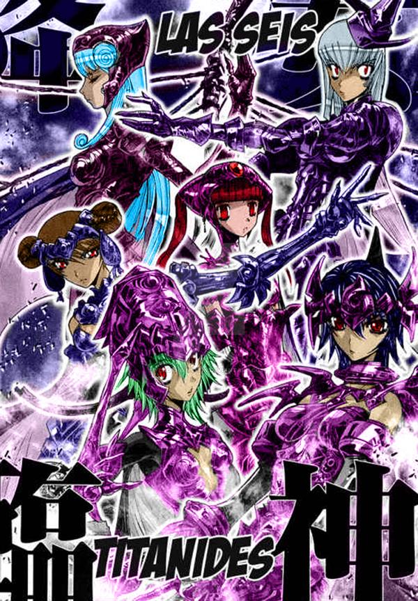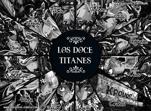 Fanart de Marco Albiero (Italia) En el manga precuela Saint Seiya Episodio G se descubre a los Titanes (ティターン 神 族, Titán Shinzoku), los hijos de Gea y Urano, una raza celestial de doce deidades (seis dioses y seis diosas) que una vez gobernaron el mundo en los tiempos antiguos. Este grupo divino es introducido como los adversarios principales de los Saints. Los doce Titanes (primera generación) son la progenie de las deidades primordiales Gaia (la Tierra) y Urano (el Cielo). Son liberados del Tártaro por Pontos, el dios primordial de las aguas, que los utiliza en su propio beneficio. Muchos se preguntan quién son y cuál es el alcance de su poder, pocos son realmente conscientes de la clase de poder mitológico que ostentan estos dioses ancianos. Poder que los dioses olímpicos respetan y temen. Su poder es el del Cosmo divino llamado Dunamis (デュナミス, Dunamisu). Primero aparecen como los principales antagonistas del Episodio G, pero algunos de ellos más adelante ayudan a los Gold Saints, pues descubren que el dios Pontos los había estado manipulando para lograr sus propios fines.