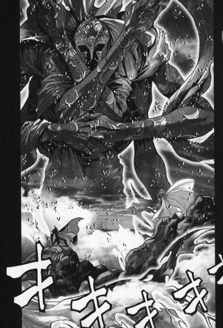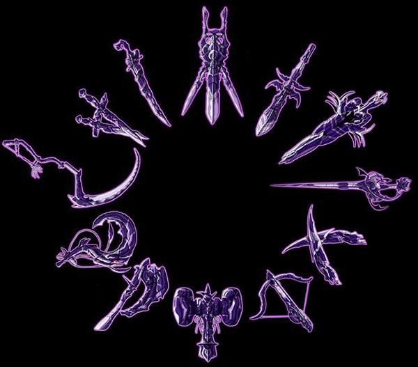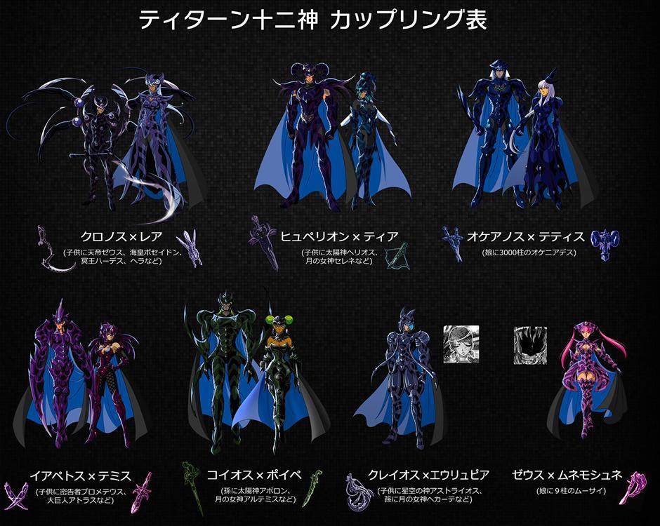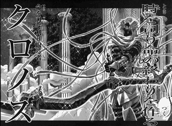 Cronos – Megas Depranon (la gran guadaña). Estas armas / armaduras fueron dadas por Gaia a sus hijos e hijas para que pudieran luchar contra la tiranía de su padre Urano. Estas armas pueden matar a los dioses, no se limitan a ser meras herramientas de ataque, y realmente pueden cambiar de forma para convertirse en una armadura. Extractos del Cosmo Special (Hypermyth) Se dice que el origen del Universo, así como el de los dioses (Zeus, Hades, Poseidón, Atenea, Ares, etc.), viene del Big Bang. Pero lo que no saben muchos es que Cronos (el padre de Zeus, Hades y Poseidón) fue quien causó el Big Bang. El Big Will (que es "la Voluntad de los Dioses") liberó el Bing Bang, y entonces emergió el Universo. Los detalles exactos de estos acontecimientos son escasos, no todo Saint Seiya sigue la línea de los mitos griegos clásicos. Pero, tras la creación del Universo desde el estado de la nada, Urano se convirtió en un tirano malvado. Gea y Urano, a su vez su propio hijo y esposo, engendraron a los Titanes. Urano oprimía a los Titanes, estos fueron encerrados por su tiránico padre, que tenía miedo de que eventualmente lo destronarán. Su madre Gaia, brutalizada por Urano, que también había encerrado en el Tártaro a sus hijos los Hecatónquiros y los Gigantes, pidió a sus hijos más pequeños los Titanes que la ayudaran a vengarse de su marido, requerimiento al que Cronos respondió positivamente. Gaia creó y otorgó a los Titanes armaduras que les servirían a la vez como armas. Estas vestiduras sagradas (armas-armaduras) se conocieron como Somas 楚真 (ソーマ) [Souma:Sooma]. El más joven y poderoso Titán (Cronos), recibió la más mortal de los Soma, con forma de guadaña y conocido como el "Megas Drepanon". Cronos, encabezó una rebelión contra su padre y lo derrotó. Después de la caída de Urano, Cronos se coronó como el Rey de los Dioses y Titanes, y reinó sobre el mundo. No se sabe mucho al respecto del lapso de este tiempo.