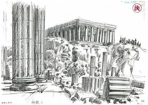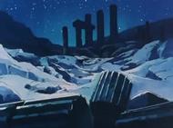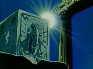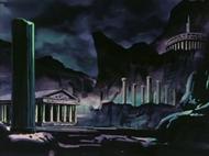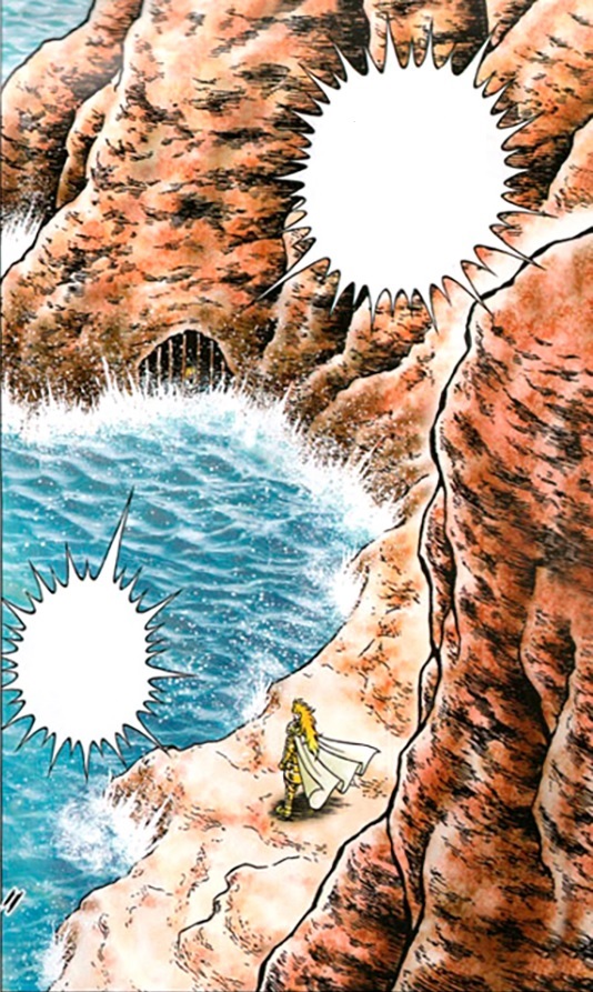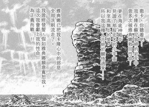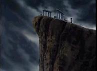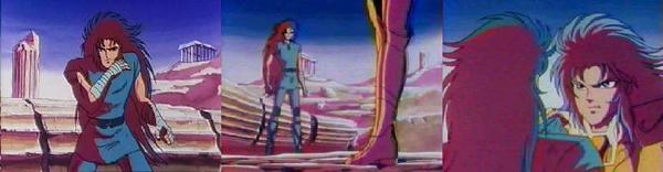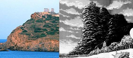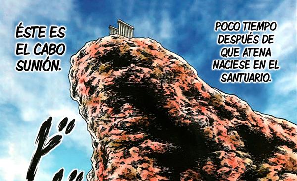 Eh.. sí, Kurumada lo habría pensado más de una vez para volver a utilizar el templo de Sounion como modelo a partir de la primera escena del manga, aquí utiliza de nuevo este lugar, pero esta vez se sabe bien que es el Cabo Sounion (la primera vez no se lo menciona), sobre todo el aspecto del cabo que aquí sirve de modelo; El Cabo Sounion existe realmente y contiene las ruinas de los templos que pertenecen a Atenea y Poseidón, pero...