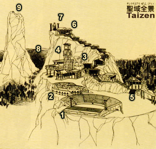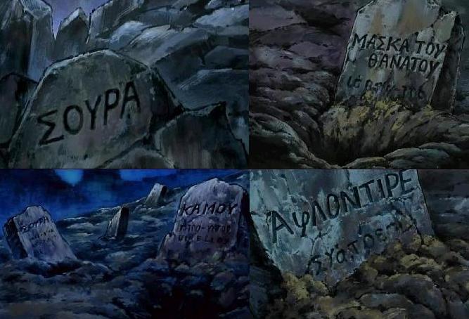 El Cementerio de Caballeros Seitōshi / Seinto no Hakaba. 聖闘士の墓場 “El Cementerio de los Guerreros Santos”. En la parte más baja del Santuario existe un campo en donde se encuentra el Cementerio de los Saints. Ireichi. 慰霊地 "Cementerio de las almas del Santuario". Literalmente: 慰霊: memoria, 地: lugar.