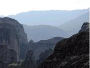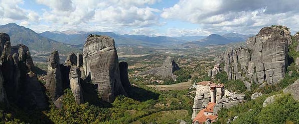 (1) Meteora o Meteoros (en griego moderno Μετέωρα Μοναστήρια Metéora Monastíria; es decir; es español, “Monasterios suspendidos del cielo”, “Monasterios suspendidos en los aires” o “Monasterios en el cielo”, en idioma griego significa “cuerpo que cae del cielo”), es conocido como el más importante centro monástico y uno de los mayores monumentos del mundo, una serie de pequeñas montañas en las cuales se elevan algunos monasterios, de la época bizantina. Meteora es una gran montaña rocosa, que representa la división de las ciudades de Kalambaka y Kastraki. De hecho son una serie de imponentes montañas o formaciones rocosas localizadas al norte de la Grecia continental, en la llanura de Tesalia, considerada por la mitología como la morada de los dioses y país de los centauros, en el valle del río Pinios (en español, Peneo). Por allí pasaba un gran río que desembocaba en el Mar de Tesalia hasta que encontró otra salida hacia el Mar Egeo y este paisaje tan especial se formó hace millones de años mediante la erosión y los terremotos.