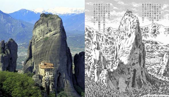 Scribe du Sanctuaire, Vincent sans pseudo (Francia) El parecido con la colina escarpada de Star Hill del manga de Saint Seiya es innegable, se puede ver bien las rayas sobre el acantilado y la similitud en la forma de la roca a la izquierda para certificar que los Meteoros sirvieron claramente de modelo. Considerando que los monasterios de Meteora fueron refugios construidos por los religiosos en las crestas rocosas y cuyo acceso sólo ellos conocían, se puede hacer una aproximación rápida a la propuesta de Star Hill del manga, pues al igual que Meteora, era un espacio de uso único para el Pontífice (capítulo 45, titulado "Su nombre es Saga"), representante de Atenea (en los países católicos de habla portuguesa la figura del "Papa" es conocido como el "Gran Maestro").