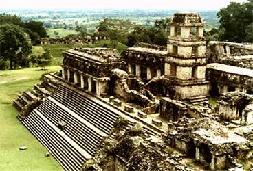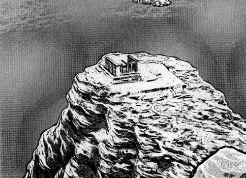 templo en su cumbre y un bosque en su base.