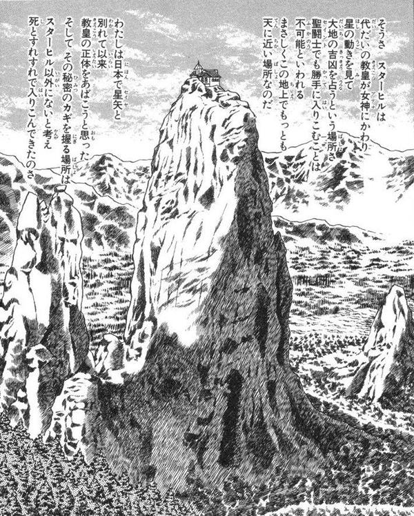 El Monte Estrellado En el manga clásico, tomo 12, Marín le explica a Shaina que ha estado en Star Hill (traducido como "Monte Estrellado"), colina escarpada dónde el Pontífice lee e interpreta los movimientos de las estrellas, para predecir el futuro del mundo, y que allí encontró el cadaver del antiguo Pontífice del Santuario. Es una parte aislada del Santuario. Star Hill es una colina sagrada que se encuentra a las afueras del Santuario. Esta es una montaña alta y rocosa con una vertiente prácticamente vertical, con una pequeña iglesias en la parte superior de la misma. Allí los Pontífices van a hacer sus oraciones y predicciones del futuro observando a las estrellas. Debido a la extrema altura del lugar es considerado la zona más cercana al cielo y, también, una puerta al Olimpo. El acceso a este lugar es muy complicado, y está prohibido para todos los Saints, incluso para los de mayor rango, siendo el Pontífice el único humano que tiene permitido ir allí, aparte de la diosa. Star Hill / Starhill. スターヒル (Sutā Hiru) “La Colina de la Estrella” o "Colina de las Estrellas" en inglés. Lugar donde los Pontífices, generación tras generación, se instalan para predecir el destino de la Tierra. Es el lugar más cercano al Cielo en el planeta y se dice que nadie puede ingresar allí sin permiso, ni siquiera los Gold Saints. Próximo a la montaña sagrada se eleva una segunda formación rocosa, más alta y delgada que la anterior, el llamado monte estrellado o Star Hill (スターヒル pron. jp. suta hiru). Se trata de una parte aislada del Santuario. Es aquí donde tuvo lugar el asesinato del Pontífice a manos de Saga de Géminis que dio origen a la conspiración de la saga del Santuario.