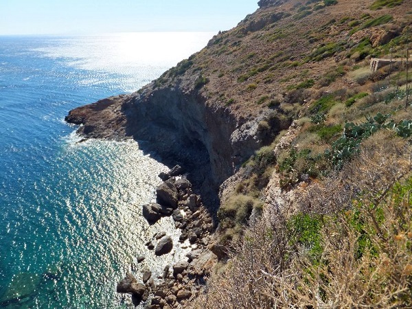 Cape Sunion no Kangoku. ケープスニオンの - 監獄 “Prisión de Cabo Sunión” En la base del cabo se camufla una prisión de agua, tallada en la base de roca del acantilado, una caverna con un espeso muro y una ventana cerrada con barrotes que mira al mar, situada justo por el nivel de las aguas, de tal manera que la marea alta sumerge casi en su totalidad el interior de la misma. En los tiempos mitológicos este lugar servía de prisión