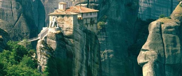 En la gran llanura de la región de Tesalia surgen de la tierra numerosas columnas naturales de roca gris oscura, un conjunto de peñascos de piedra arenisca formados bajo el mar hace 30 millones de años, talladas por la erosión y de considerable altura, caprichosos pináculos de arenisca modelados por el tiempo y la erosión. Estas fascinantes formaciones esculpidas a lo largo de la historia quedaron al descubierto al bajar el nivel del mar y son llamadas Meteora (que significa "rocas en el aire"). Desde tiempos inmemoriales ascetas y ermitaños vieron en este lugar el escenario perfecto para dedicarse a la oración y al retiro, aunque no fue hasta el siglo XII cuando cristianos ortodoxos crearon la primera comunidad monástica. Con la fe como argamasa, se inició la construcción de estos monasterios encaramados al borde del abismo, ‘escaleras’ para acercarse a la Divinidad. Sobre estas masas rocosas se construyeron algunos monasterios a modo de refugios, fueron creados en el tiempo bizantino en el siglo XIV para permitir a los monjes escapar de las persecuciones de los turcos y de los albaneses de la época que invadieron Grecia. Los sacerdotes ortodoxos de la región no tenían muchas alternativas y decidieron esconderse en la parte superior de las crestas rocosas cuyo acceso sólo ellos conocían, además el enclave facilitaba las condiciones idóneas para la vida ascética (los ascetas son personas que se dedican a la práctica del perfeccionamiento espiritual mediante un estilo de vida austero y sencillo, se retiraran a rezar). Los eremitas vivían en las cuevas de las rocas y en chozas al pie de los peñascos como ermitaños, acudiendo a una iglesia central donde se reunían los días festivos y domingos.