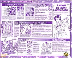 V - "El Hipermito" (La leyenda de los orígenes de Saint Seiya): SINOPSIS: Cronologia de Saint seiya al estilo "Apendices del Señor de los Anillos" resumiendo el mundo de Saint seiya desde el origen del Big-Bang. Algunas cosas han quedado desfasadas pues es un texto que se publicó antes de la Saga de Hades en manga. "La Historia de las Grandes Guerras Santas", popularmente conocida como "Hipermito" o Hypermyth, es un artículo o texto interesante publicado en el Cosmo Special el 10-08-1988 (a mitad de la saga de Poseidón del manga) que recopila y resume "La mitología propia de Saint Seiya", una mitología independiente que no necesariamente guarda relación directa (salvo algunos puntos) con la mitología griega clásica o aquella publicada en el kurumanga (no es algo que se haya respetado estrictamente), revisada y corregida por Masami Kurumada a partir de la mezcla eficaz de todas las mitologías (principalmente la griega), leyendas, creencias o religiones existentes en el mundo. Este relato permite una mejor comprensión del Universo de Saint Seiya, está dividido en 6 eras, cuenta el inicio de Saint Seiya desde los orígenes de los tiempos, el nacimiento del universo, la aparición de los primeros dioses, las antiguas guerras santas (‘Holy Wars’) de Ares y Hades, el origen de los Saints y las armaduras (Cloths) de Atenea, hasta llegar a la era moderna. Un documento con mucha información retrospectiva y elementos vinculados con los capítulos siguientes, lo que hizo que muchos fans especularan con el hecho de que Masami Kurumada lo escribiera directamente o al menos diera ideas clave para su redacción. "En preparación de la próxima guerra santa, la fundación Graad estudió las mitologías del mundo entero y condujo investigaciones en los lugares antiguos. El resultado de este trabajo ha permitido establecer una "super-mitología" (hypermyth) que aclara las diferencias entre los mitos y las leyendas ..." - "Las innumerables guerras santas que tuvieron lugar desde los tiempos antiguos son explicadas en este documento". Es una obra seria, un texto bien estructurado que explica puntos precisos del manga y aclara varios temas dudosos de la serie, dándole un aspecto místico, y que da libertad para dejar volar la imaginación. Es como el Taizen, una fuente primaria del Universo Saint Seiya y de su génesis. Publicado en el "SAINT SEIYA COSMO ESPECIAL" (el databook y artbook consagrado al Manga de Saint Seiya), número único fechado el 10 agosto 1988 (fue publicado cuando el manga aún estaba en la fase de Poseidón, dando algunas pistas sobre lo que venía después: Hades), su lectura es indispensable pues es un material de conocimiento obligatorio para el fan de Saint Seiya. NOTA : Originalmente, el término "Hipermito" (Hypermyth) aparece no como título del compendio, sino como una mera referencia en el interior de la propia publicación. El caso es que los primeros fans franceses que los tradujeron pensaron que sería más llamativo y atrayente el término "Hipermito" que "La Historia de las Grandes Guerras Santas". Hipermito es una palabra creada por Fabien Royer, el primer fan francés que se ocupó de la traducción de este documento en 1995). Si buscamos ??? en Google nos da "ULTRA MYTH", en inglés podemos escoger : super-; ultra-; hyper-; very, really (conversational). De todos modos, dada la popularidad del término, no queda mal el mantenerlo, puesto que es utilizado dentro del propio documento. VI -"Cronología de Saint Seiya" : Como empezó todo y la forma en que todo acabó. Aquí tenéis una completa cronología -sin fechas concretas- elaborada por fans de los hechos acontecidos en Saint Seiya desde la era mitológica hasta la saga Meikai-Hen. Se trata de una especie de resumen esquemático que incluye todo lo que narra el Hipermito, más lo que sabemos del Manga y el Anime, así como un poco de mitología griega y ficción añadida para que el discurrir de los acontecimientos sea coherente y entretenido (incluimos espléndidos fanarts del peruano Carlos Alberto Lam Reyes y otros fanartistas).
