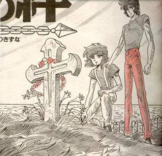 la imagen del Outside Story que desees leer I - "Ikki & Shun" Outside Story 1: SINOPSIS: Narra un período de convivencia de Ikki y Shun, centrándose en sus relaciones fraternales y los vínculos del Bronze Saint del Fénix con los Black Saints de la Isla de la Reina de la Muerte (Death Queen Island), aunque no aporta datos muy interesantes a la trama general de la historia. Estos eventos no encajan en la línea de tiempo de la teleserie pero suceden después de que Ikki fuera enterrado por Docrates y regrese junto a los Bronze Saints. La historia se centra en Shun, quien se pregunta donde está su hermano. No tiene ningun lugar donde instalarse por lo que Saori le permite residir en la mansión Kido. SPOILER: Tras los combates que enemistaron a Ikki y los demás Bronze Saints, justo después de que los Bronze Saints derroten a Docrates e Ikki parezca que haya muerto, el Fénix regresa junto a su hermano a Japón, juntos conversan y visitan la tumba de su difunta madre. Después de charlar sobre sus recuerdos y el pasado tortuoso, se separan nuevamente, Ikki desaparece tras comentar que no le apetece integrar el grupo. Shun regresa a la mansión Kido y esa misma noche es atacado por cuatro Black Saints, una nueva generación de caballeros negros liderados por Ritahoa, a los que derrota con ayuda de su hermano. Al final de la historia Ikki entrega a Shun una cruz que era un recuerdo de su madre y desaparece como un buen lobo solitario. Los aspectos más destacados de esta historia son el hecho que Ikki le diga a Shun que es un calco de Esmeralda, su verdadero amor, con la única diferencia física del color de su cabello, y cómo la constitución física de Shun es muy parecida a una estatua griega, con un cuerpo y piel perfectos. También revela los nombres de los Black Saints: Black Pegasus Kenuma, Black Swan Jido, Black Dragon Shinadekuro y Black Phoenix Ritahoaa. Black Andromeda es el único cuyo nombre no es revelado. De alguna manera, esta historia parece que nos indica que había más copias negras de las armaduras de bronce de Pegaso, Cisne, Dragón y Andrómeda, además de las nombrosas del Fénix que vimos en la teleserie. Publicado en el JUMP GOLD SELECTION 1 con Fecha 13 de Julio de 1988, el guionista es Takao Koyama, el "Chief Writer" de la serie, y los dibujos son de Nobuyoshi Sasakado. Esta historia alterna es prácticamente texto con pocas ilustraciones. NOTA: Este Outside Story fue traducido en 2006 del japonés al portugués por los webmasters de la página brasileña Taizen Blogger (uno de nuestros websites afiliados), y con su autorización la he traducido al castellano. Era la única historia alterna que nunca había sido traducida (quizás porque como hemos dicho no aportaba gran cosa) a pesar de que ya han pasado tantos años desde su publicación. II - "Excalibur Secret Chapter" Outside Story 2: La siguiente historia se supone que es la verdadera historia de la toma del poder del Santuario por Saga, 13 años atrás, si consideramos el anime como válido, por supuesto. Cuenta los acontecimientos misteriosos que tuvieron lugar en el Santuario y que condujeron a la muerte del verdadero Pontífice, Shion, ex Gold Saint de Aries y superviviente de la última guerra santa, a manos de Saga, y la tentativa de asesinato a Atenea que vino después, también a cargo de Saga, el cual ya en ese momento vestía los hábitos y había usurpado la identidad del Pontífice. Esta historia también responde a una gran pregunta que muchos fans se hicieron sobre la identidad de ese famoso Ares, el nombre que se le da al Pontífice criminal / usurpador en el anime, y quien se supone es el hermano menor del antiguo Pontífice según palabras de Seiya (episodio 17), que ocupa su lugar después de su muerte. "Ares" que la versión francesa del anime nos transformará en "Arles" a través de un error de traducción que se solapó a varios idiomas desgraciadamente.. SINOPSIS: Esta historia ocurre 13 años antes del punto de inicio de la teleserie de anime, las Batallas Galácticas (el torneo Galaxian Wars), profundiza sobre la relación entre los Gold Saints Aioros de Sagitario y Shura de Capricornio, y aporta información sobre el rol del Gran Patriarca, los eventos que preceden al asesinato de Arles (el “polémico” personaje de la teleserie, supuesto hermano menor del Pontífice precedente -Shion- asesinado por Saga de Géminis) y como Saga se convierte en el Pontífice del Santuario. SPOILER: Desde el punto de vista de Shura de Capricornio narra los importantes acontecimientos ocurridos desde el nacimiento de la reencarnación de la diosa Atenea hasta la muerte del Pontífice a manos de Saga, explica el regreso del joven Shura de Capricornio al Santuario tras su entrenamiento en España y su reencuentro con su amigo Aioros. Tras su llegada, Shura conoce al silencioso Saga de Géminis, cuya conducta le produce desconfianza, recelos y sospechas. Esa misma noche, el Pontífice sufre un atentado cuando un mariner de Poseidón con el rostro oculto intenta matarlo. Al día siguiente, Saga se revela como el asesino enmascarado, mata a Arles y toma su lugar dispuesto a hacer lo mismo con Atenea. Sembrando un misterio con su desaparición repentina, ordena a Shura que elimine a Aioros, con el engaño que este planea matar a Atenea. Un año después, tras la muerte del Pontífice sin sucesor designado oficialmente, y el nacimiento de la reencarnación de la diosa, Arles (o sea Saga encubierto) asume el control del Santuario, sólo 13 años después asesina finalmente a Shion y usurpa su lugar como Pontífice. Este Outside Story presenta a un personaje inédito: Arles, al que define como un Silver Saint con privilegios (cuya constelación es desconocida) que asiste al anciano Pontífice Shion en sus funciones y tiene acceso a los aposentos de Atenea. Si el Pontífice muere es el Altar Saint quien se supone que toma su lugar hasta que un nuevo Gold Saint sea escogido para ser el nuevo Pontífice.