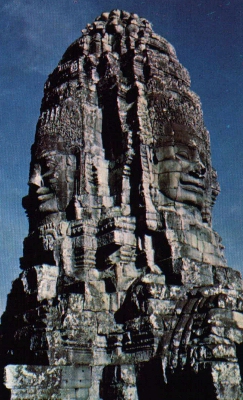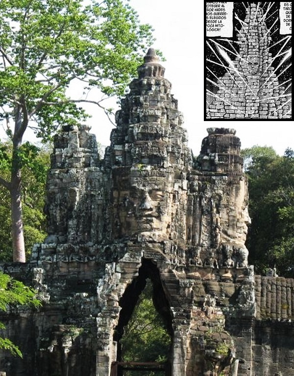El templo Bayon de Angkor Thom, se levanta sobre una terraza de piedra. Sus 54 torres que se parecen a las torretas en forma de brotes de loto de Angkor Wat se arraciman en torno al capitel central del monumento. Cada torre está tallada en sus cuatro caras apuntando a los cuatro puntos cardinales. Se cree que las cuatro caras representan al Bodhisattva, un ser que ha alcanzado el estado divino de Buda (la iluminación) pero que elige permanecer en la tierra para ayudar a otros a que encuentren su camino. Otra versión apunta más al simbolismo de que las caras representan al dios mirando a todos los puntos del antiguo reino en señal de dominio y protección del mismo. Se trata del llamado templo montaña, y se comprende porqué observando sus formas y geometrías atrevidas que de lejos recuerdan enormemente un relieve montañoso. En Saint Seiya la idea ha sido retomada y tenemos la impresión que la torre de los espectros se parace a una montaña. Varios templos-montaña fueron construidos entre 802 y 1432, durante esos 6 siglos durante los cuales el imperio Khmer era una potencia dominante del Sur asiático. El primer soberano en construir una montaña así fue Jayavarman II (reinado de 802 a 850). Ha instaurado una especie de culto del soberano divinizado, y era de religión Sivaista, estima que su poder era la esencia divina de Shiva, y visto que la estancia de Shiva fuera el monte místico Meru, Jayavarman decidió construir les primeros templos-montaña que representaran el monte Meru, centro del Universo.