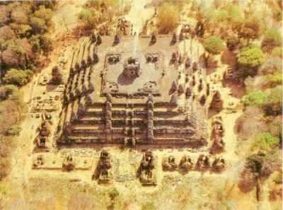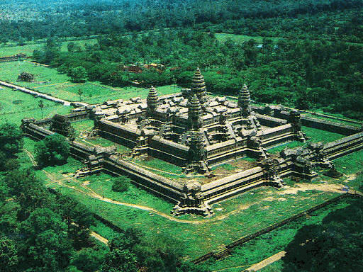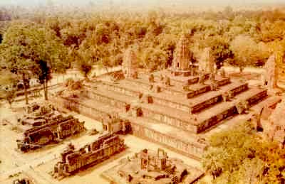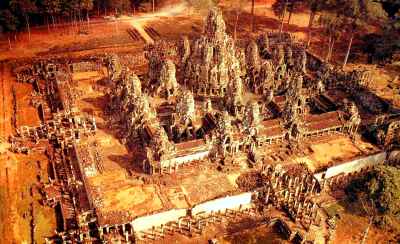 Así como el hipotético y legendario hogar de los dioses hindúes en el monte Meru se creía situado al norte del Himalaya en una región rodeada de lagos (algo parecido a la idea del paraíso cristiano), los templos importantes de Angkor tratando de reproducir la situación geográfica se ven provistos y circundados de extensos fosos de agua. Además este sistema de suministro de agua desempeñaba un papel distinto al meramente simbólico. Tanto templos, fosos y represas como el resto de edificos y elementos arquitectónicos disfrutan de una excepcional carga de adoración a los dioses, habiendo sido construidos en honor de ellos. El crecimiento de Angkor La ciudad de Angkor tuvo muchísimos reyes a lo largo de toda su historia, los cuales construyeron la multitud de templos de los que se compone. Para evitar un extensísimo análisis de reyes y templos, solamente nombraremos a los reyes y templos más importantes de todos, en orden cronológico. En el año 802, dos años después de la coronación en Roma del gran rey franco Carlomagno, en una ceremonia oficiada por un brahman hindú, Jayavarman fue nombrado monarca universal, un dios-rey, la sustancia de Shiva. El acto de Jayavarman en parte se diseñó para liberar a su pueblo, los khmeres, de la influencia invasora de Java, donde una dinastía budista había expulsado a sus vecinos hindúes. Jayavarman construyó en el Monte Kulen (a unos 40 Km al nordeste del actual complejo de Angkor) una serie de torres cuadradas de una sola celda, con techos altos y escalonados, que recordaban el celestial Monte Meru del hinduismo. Jayavarman comenzó a descender a las tierras bajas y allí estableció una nueva ciudad capital conocida como Hariharalaya, la precedente de Angkor. Erigió en la planicie versiones más grandes de las pirámides escalonadas del templo-montaña del Monte Kulen. Aunque las pirámides se habían usado con anterioridad en Mesopotamia y Egipto, no tenían precedentes en la India. A pesar de ser practicantes de la religión hindú, los camboyanos habían desarrollado una forma arquitectónica propia. En el año 877 Indravarman I coronado rey, mandó construir el Bakong, "el templo que expulsa piedra", templo principal de la antigua Hariharalaya. Se trata de un gran templo montaña de cinco niveles, para cuya construcción empleó 100 veces más material que el que se había usado para cualquier templo anterior. De todos los templos de terrazas en niveles de la región de Angkor, el Bakong es quizás el templo que más estrictamente responde a la idea del monte Meru cósmico en 5 niveles, correspondientes de abajo a arriba al mundo de los Nagas, los Garudas, los Rakshasas, los Yakshas, y después al de los Maharajas de los 4 puntos cardinales con su corte.
