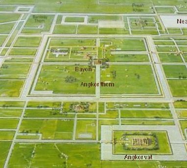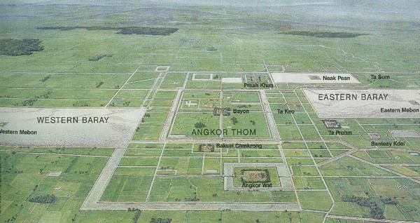 Indravarman I creó la urbanística jmer, que tenía que ver con la concepción del mundo: la ciudad de planta cuadrada representa el mundo; las murallas que la rodean las montañas; los canales y fosos el océano; y en el centro el templo-montaña. En el año 889 d.c. el rey Yasovarman I sucede a Indravarman I e inicia una extensa construcción de templos y otros edificios que durará cuatro siglos y cuya extensión abarca una zona del tamaño de la isla de Manhattan. El rey Yasovarman I, construyó la primera villa de Angkor y su primer trabajo fue el gran Baray occidental, un estanque artificial (hoy a medio nivel) de 7 kilómetros de largo por 1,8 kilómetros de ancho, un embalse para contener el agua, en el centro del cual se elevaría el santuario real, en forma de templo–montaña.