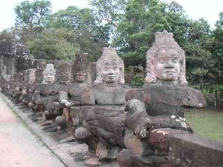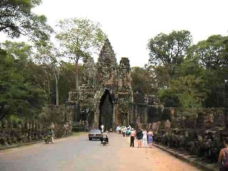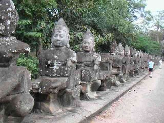 Está rodeada de una muralla cuadrangular de 3 kilómetros de lado y 8 metros de altura. Sus 5 puertas de entrada son monumentales, de 3,5 metros de ancho por 7 metros de alto y antiguamente cerradas con grandes puertas, y todas tienen un camino flanqueao por 54 devas (dioses) a la izquierda y 54 ashuras (demonios) a la derecha. Curioso dato si lo comparamos con Saint Seiya: 54+54=108....¿espectros?