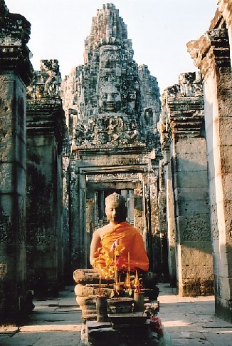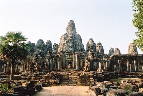 La torre mide 45 metros de altura y el templo tiene una extension de 12 kms, fue construido en el siglo XII por el rey Jayavarman VII. Está en la antigua ciudad real Angkor-Thom, que tiene una extension de 400 kms2 y cuyo origen se situa en el reinado de Jayavarman II (810-850 d.C.). El explendor de Angkor duró hasta el año 1.225, cuando fue conquistada y arrasada por los Chams. Desde entonces estuvo escondida durante siglos en medio de la selva, hasta que en el año 1.860 fue descubierta por misioneros franceses. Angkor proviene del sanskrito "nagara" y significa "villa real", función que ocupó durante el siglo X hasta 1431. S ervia de sala de asamblea de los dioses.