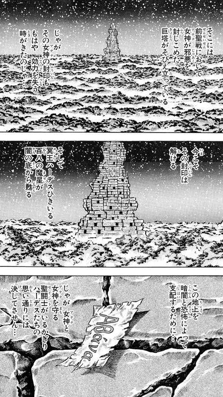 13 (España) La última Guerra Santa Hace 243 años (229 años atrás del inicio de la epopeya de Saint Seiya con la conspiración del caballero dorado Saga de Géminis en el Santuario), tuvo lugar el enfrentamiento entre dos divinidades: Atenea diosa de la Sabiduría y protectora de la Tierra y Hades, dios del Reino de los Muertos. En esta Guerra Santa, Atenea resultó victoriosa y atrapó las almas de los 108 espectros de Hades. Sin embargo, el cuerpo original de Hades no fue destruido. Además, esta batalla resultó mortal: sólo dos de todos los Santos de Atenea que pelearon en ella sobrevivieron: Dohko, santo de oro de Libra y Shion, santo de oro de Aries. Atenea les encomendó a cada uno una tarea específica: - Shion sería el nuevo Patriarca del Santuario de Atenea en Grecia y tendría la misión de reconstruir y proteger el Santuario, además de preparar el escenario para la próxima Guerra Santa. - Dohko se encargaría de vigilar el lugar donde fueron selladas las almas de los espectros. Para esto, se establece en los Cinco Picos de China, aproximadamente 1000 km al este, del lugar donde están encerradas las almas de los espectros. La prisión de los 108 masei es una gran torre situada en una zona inexplorada de Oriente. En el principio del capítulo de Hades: ¡las 108 estrellas maléficas se liberan del sello de Athena, la guerra contra el dios de los muertos va a comenzar!.