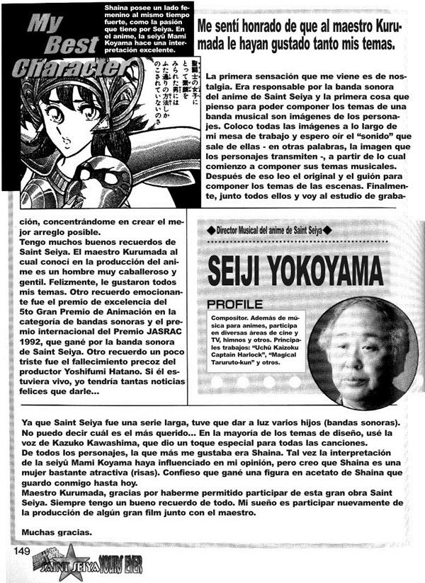 Yokoyama 1) ¿Podría decirnos de qué manera empezó a involucrarse con Saint Seiya?. Yokoyama: Fue Hidetoshi Kimura de Nihon Columbia (ahora Columbia Music Entertainment) quien me puso en contacto con este proyecto. Me dijo "esta vez nosotros nos encargamos de un producto llamado "Saint Seiya". Yo leo pocos mangas, así que era la primera vez que tuve que trabajar en este tipo de obra. Recuerdo que me dijo: Como te confío esto, compone músicas impresionantes...". 2) ¿Cómo fue el proceso de concepción de la música de Saint Seiya?. Yokoyama: Comencé preguntando por imágenes en color de los personajes. Yo también leí un poco el manga y luego colgué imágenes de Seiya, Saori, Ikki y Shiryu en las paredes de mi despacho, y luego compuse la música que corresponde a la visión que me inspiraron. Si me contenté con leer un poco del manga fue porque si estoy demasiado inmerso en la historia termino componiendo una música de apoyo que simplemente se ajusta a la historia. Pero como yo soy un tipo de persona que desea que una música pueda vivir por sí misma, compongo mis siguientes piezas con la imagen que se forma en mi mente. Para mi gran alegría, Masami Kurumada disfrutó de la música y luego me envió de vez en cuando cartas para expresarme su satisfacción. En lo que concierne a las películas, recibí guiones gráficos y mi música se basó en eso. 3) Usted lanzó comercialmente muchos álbumes en aquella época, y Saint Seiya por si solo debió manternerlo muy ocupado, ¿no es cierto?. Yokoyama: En ese momento, mis discos no se vendían. Pero por una razón u otra, la música de Saint Seiya se vendió bien y entonces saqué álbumes cada dos o tres meses. Además, como trabajaba en muchas otras producciones animadas, estuve increíblemente ocupado en ese momento. Pero mirando hacia atrás, recuerdo este período con nostalgia. En esa época, el productor Hatano me dijo "Me gustaría que produjera música como usted la siente. No hablemos de dinero. Le dejaré decidir cuántos interpretes necesita". Nunca había sentido tanta gratitud hacia otro trabajo. 4) Usted estuvo extremadamente involucrado con Saint Seiya durante dos años. ¿Qué impresión guarda?. Yokoyama: En efecto. Incluso cuando compuse para otros trabajos, Saint Seiya aparecía de manera intermitente en algun rincón de mi cabeza. Cuando comía o tomaba un baño, me dejaba llevar por ideas para música y me venía por pensar "ah, usaría eso en Saint Seiya" (risas). Es extraño, pero este es ese tipo de ideas reinsertadas en la obra las que se hicieron populares. 5) ¿Cuál es la composición de Saint Seiya que más le ha marcado?. Yokoyama: Las primeras películas utilizaban el opening de la serie de televisión para introducir el título de la película, pero con motivo de "la leyenda del joven escarlata" (Abel), el director de escena Shigeyasu Yamauchi me pidió que compusiera una música que se utilizaría para la parte que funcionaba como título. Fui muy feliz de que le gustara inmediatamente. Me encanta esa música. Le sugiero que la escuche. 6) "La leyenda del joven escarlata" tenía un nivel de acabado por encima de las otras películas de Saint Seiya. Yokoyama: Ah, sí? Me gustaría trabajar antes de mi muerte en una buena película de Saint Seiya orientada a nivel internacional. Aunque de hecho actualmente trabajo con Masami Kurumada en una película que debería ser de una buena longitud, quizás de una hora y media. Pero los films de animación son caros (risas). Pero yo realmente tengo ganas... Es una historia inspirada en Saint Seiya pero las sinfonías utilizadas en "Choryoku Sentai Oranger" fueron grabadas en París reuniendo a artistas populares de Europa y del Conservatorio de París. Como Saint Seiya fue difundido en Francia, cuando el compositor anunció mi nombre, las niñas exclamaron "Yokoyama!", sorpresa. Eso me hizo muy feliz (risas). 7) ¿Qué impresión le deja Saint Seiya?. Yokoyama: Saint Seiya es una obra extremadamente importante para mí, y espero que la música de Saint Seiya se oiga en mi funeral (Risas). Por supuesto, que también pensé eso al componer canciones en obras posteriores, y diciéndome que me gustaría una música en particular durante mi funeral (risas). Pero cualesquiera que sean los años que pasen, Saint Seiya sigue siendo una opción segura. Quiero, en particular, que pasen la música de los créditos finales de la película "el ardiente combate de los dioses", la que comienza con los coros masculinos. De hecho, pensé retirarme a los 65 años, pero a fin de cuentas, todavía continúo trabajando en todo tipo de cosas hoy en día, a los 68 años. Si me llaman para un trabajo relacionado con el campo de la animación, creo que respondería presente.