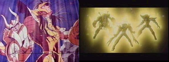 - El brillo dorado: Cuando los tres héroes visten las armaduras de oro y descienden hasta el suelo el brillo dorado no varía a medida que se acercan al suelo. - al invocar la