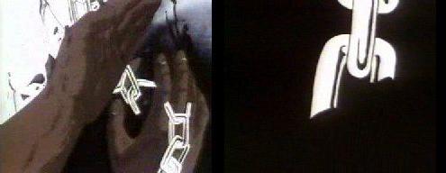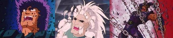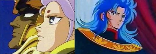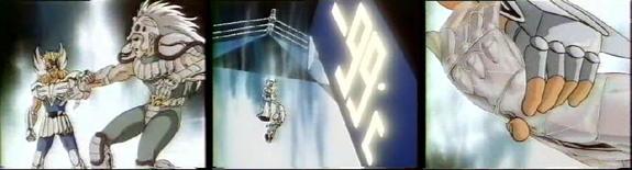 - El pelo del Patriarca (A): Si observamos con cuidado la siguiente imagen observamos perfectamente la escena en la que Seiya pelea con Cassios para obtener su armadura (episodio 1 del Anime)... ¿notan algo raro?. Sí, asi es... ¿Qué Patriarca es este?, este "Patriarca" tiene el cabello color CAFE (marrón) y sabemos posteriormente que el Patriarca llamado Arles (el usurpador: Saga de Géminis) lo tiene GRIS (cuando es malo) y a veces AZUL (cuando es bueno). También sabemos que en el manga Saga mató al Patriarca Shion 13 años atrás en el monte estrellado (Star Hill) y tomó posesión del Santuario, Shion en las ovas de la saga de Hades aparece con el pelo VERDE.... entonces si Saga tiene el pelo azul o gris y Shion verde ¿por qué está aqui color Café?.