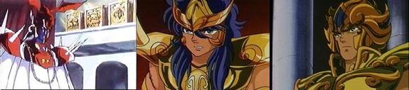 Tal vez este detalle no tiene mucha importancia pero debería haber más escenas y diálogos donde se detallara todo esto y no dejarlo nuevamente a la imaginación del televidente o al hecho de que si leyeron el manga o no. La creación de las 11 últimas armaduras hizo tambalear los planes de Kurumada, el cual se vió "atrapado" por explotar ese filón escenarístico más o menos imprevisto. El concepto de las Gold Cloth y los Gold Saints se formó poco a poco en su cabeza, notablemente con la invención de las 12 casas del zodíaco, las cuales sitúa en el Santuario y que también son rediseñadas en el Anime después del Manga. Logrando uno de los mayores atractivos de su obra, los 12 caballeros de oro del zodíaco defendiendo sus 12 templos en el Santuario de Atenea. - Saga y la armadura de oro de Sagitario (A): El falso Patriarca insiste una y otra vez para que sus secuaces recuperen la gold de Sagitario pues "si llega a apoderase de la armadura Dorada podría dominar el mundo", pfff.. sin comentarios. - Caballeros sin constelación (A): existen toda una serie de personajes que usan armadura y aparecen puntual o esporádicamente, fueron CREADOS SÓLO PARA LA VERSION ANIME de la serie pero no se dice ni consta que constelación representa su armadura, su rango ni sus poderes, son personajes de la serie TV diseñados por Toei Animation, inéditos en el Manga, que se usaron como caballeros de bulto o de relleno para que Kurumada tuviera más tiempo para dibujar el comic. De ahi se explica la falta de coherencia con el universo de Saint Seiya (Reda y Spica, Docrates, los espectros de los abismos, Crystal, Caballero de la Llama, Spartan, Agora etc..), todos ellos están analizados en el articulo los 88 caballeros.