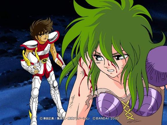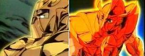 - Seiya vs Giste (la web alternativa) : Durante su periplo por la Isla Espectro, Seiya llega hasta el castillo de Giste para recuperar el casco de oro de Sagitario. Por mucho que quieran hacernos creer que forma parte de la lógica del combate, a nadie escapa el hecho de que decirle a una mujer que es capaz de distinguir su presencia entre las dobles debido a su olor, es equivalente a llamarla sucia…. con letras mayúsculas. O sea, que ya comenzamos faltando al respeto. Basta con que Giste deje los jueguecitos ilusorios, salga de su escondite y se ponga seria para que Pegaso se vea reducido e inmovilizado por sus garras. Pero claro, los guionistas siempre tienen un as guardado en la manga. Al igual que pasó con Fénix, enseguida una voluntad justiciera se apropia de la armadura de oro, acudiendo en defensa de su protegido e impactando de forma brutal en Giste, que lógicamente no se esperaba tal ataque procedente de un objeto supuestamente inerte. Tras rozar la muerte, Seiya consigue vencer a Giste con la ayuda del casco de oro.
